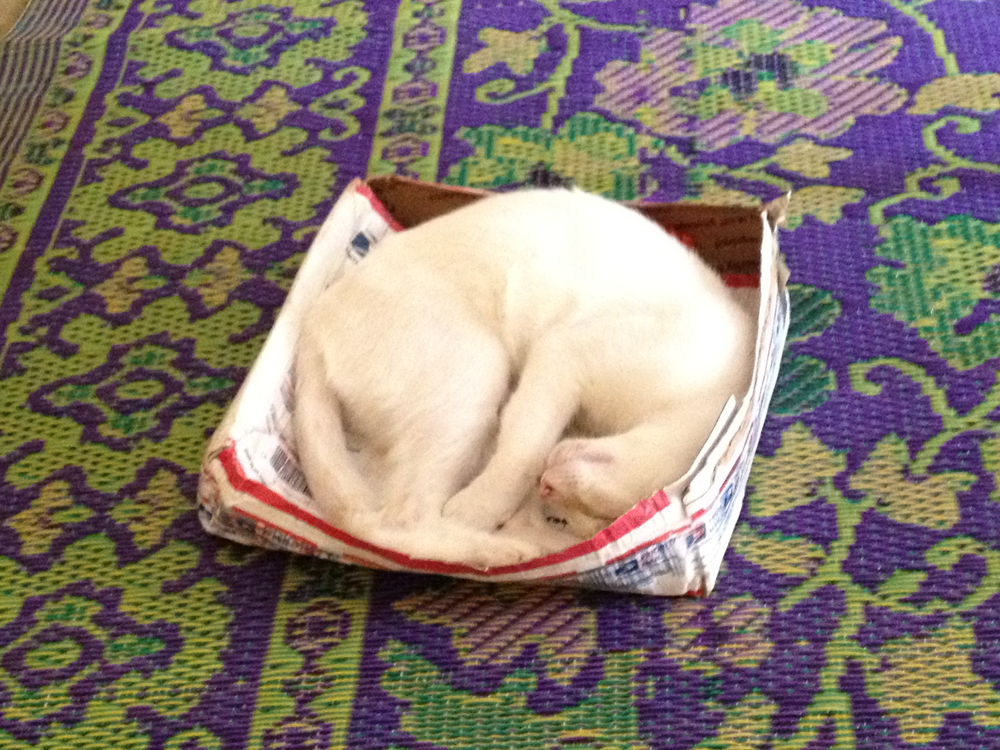He cried in his crate the whole time I was packing the rest of my things, but amazingly enough was mostly quiet once we were on the road. The crying resumed as soon as we were at my house, until I could get the wires holding the crate closed untwisted. By that evening I was sure that yes, I was a little bit allergic to him, but fortunately the symptoms seem too have mostly subsided by now. That night, he vomited on my dirty laundry pile. I think he’s starting to learn that he is not allowed in my bedroom, but he still likes to cry when I am in there without him.