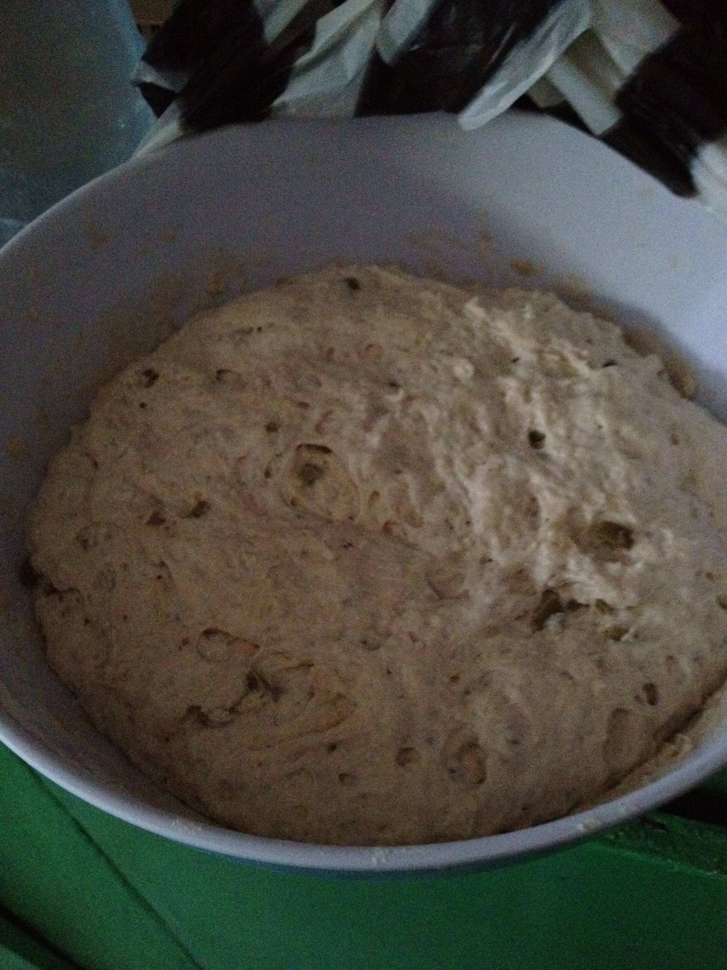 Combine the flour, salt, yeast, and any optional flavorings and mix. Add water and knead it together until it forms a somewhat shaggy dough (it should stick to itself more than it sticks to you). Then, cover the bowl with big plastic bag so the dough doesn’t dry out, and let it rise in a warm part of your kitchen for about 8 hours or overnight. One it had risen it should look something like this: